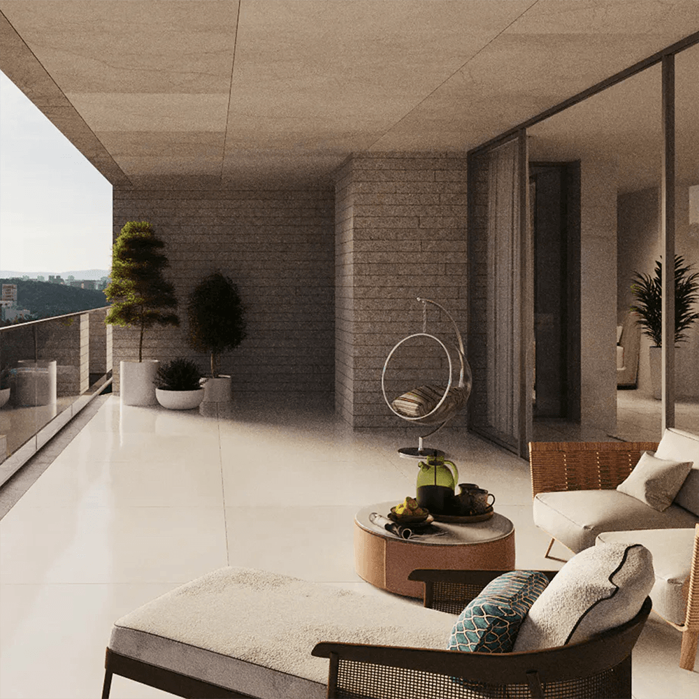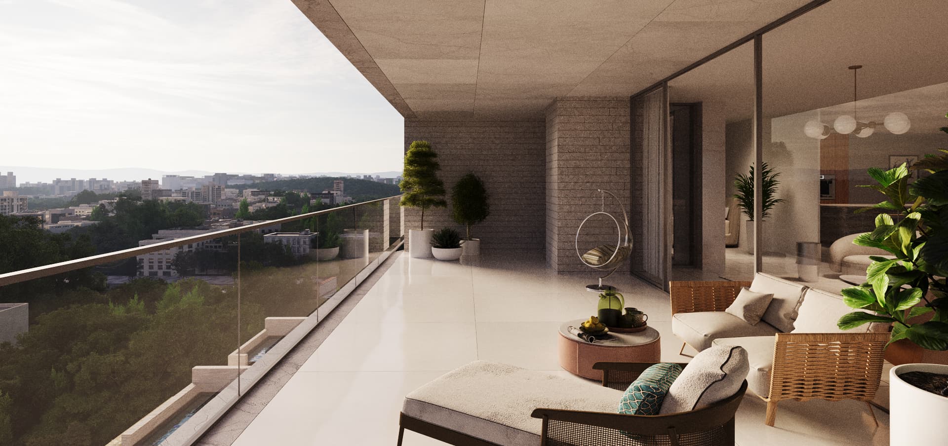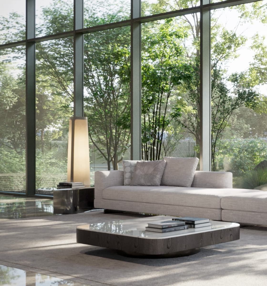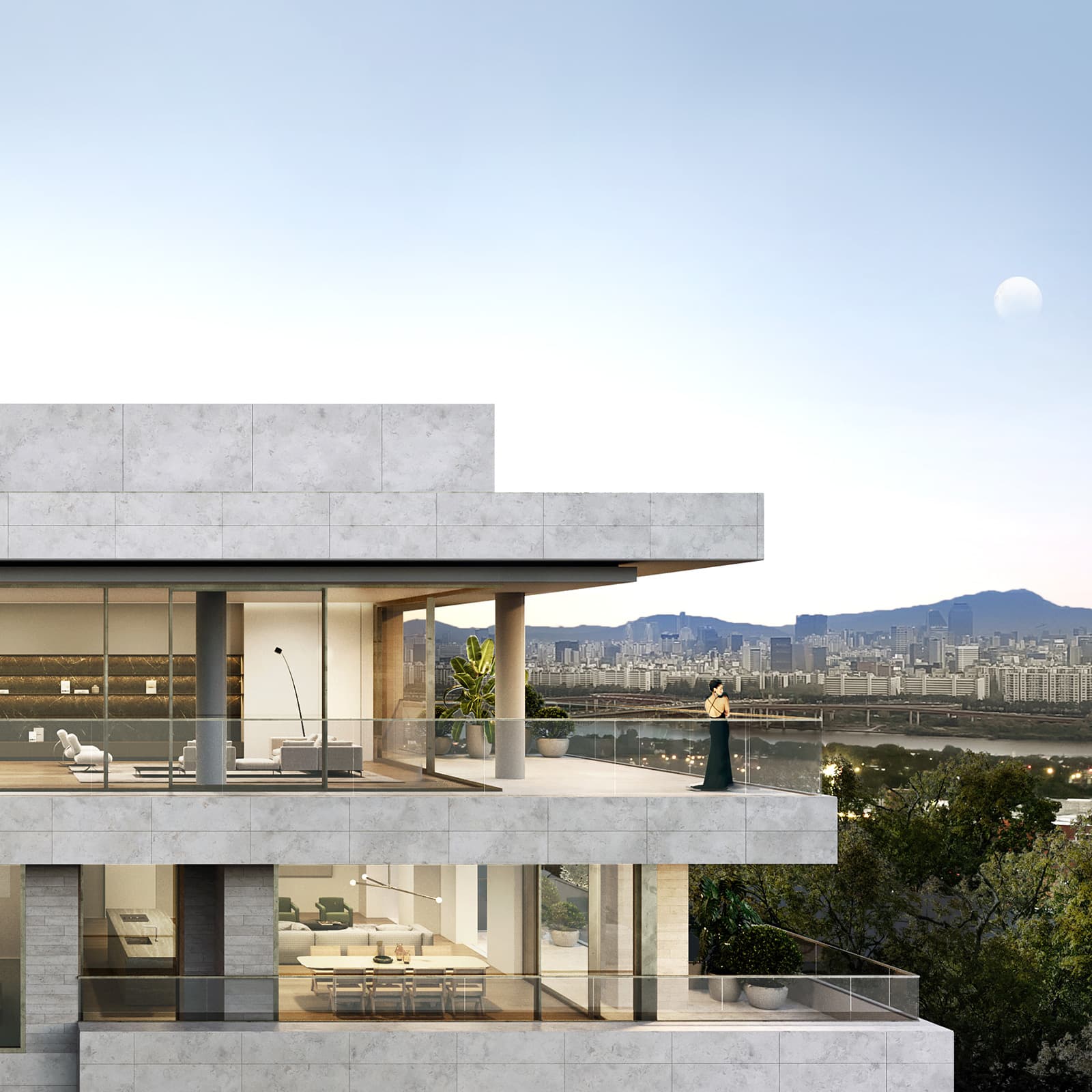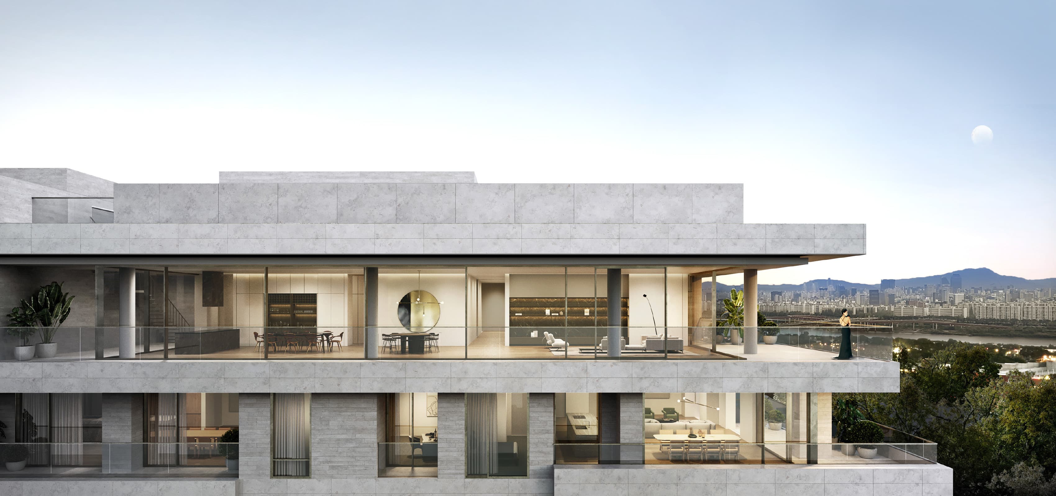 커튼월로 둘러싸인 Glass House, 현대 건축의 거장 Ludwig Mies van der Rohe의 Farnsworth house에서 영감을 받아 남향을 포함한 3면이 넓고 깊은 테라스로 도심 주거에서 볼 수 없었던 거대한 스케일의 파노라마 뷰와 함께 도심 속 나만의 안식처(retreat)가 되어 자연 속에 침잠하는 당신만의 안온함을 가지게 합니다.